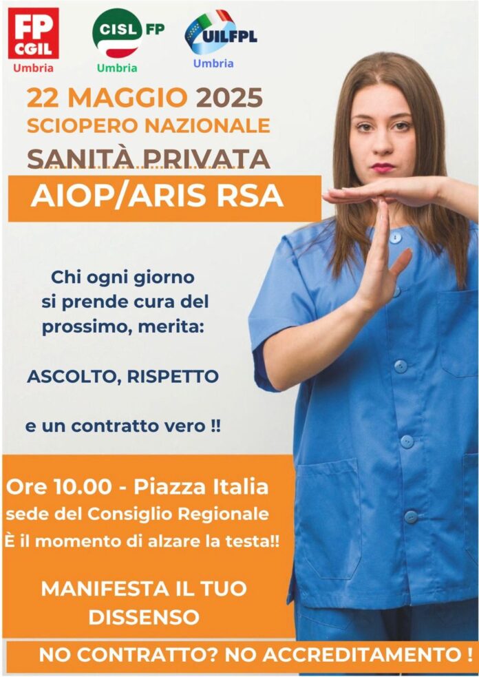 Il 22 maggio le lavoratrici e i lavoratori della sanità privata scendono in piazza in tutta Italia. Anche in Umbria è previsto un presidio regionale in Piazza Italia a Perugia, davanti alla sede del Consiglio Regionale.