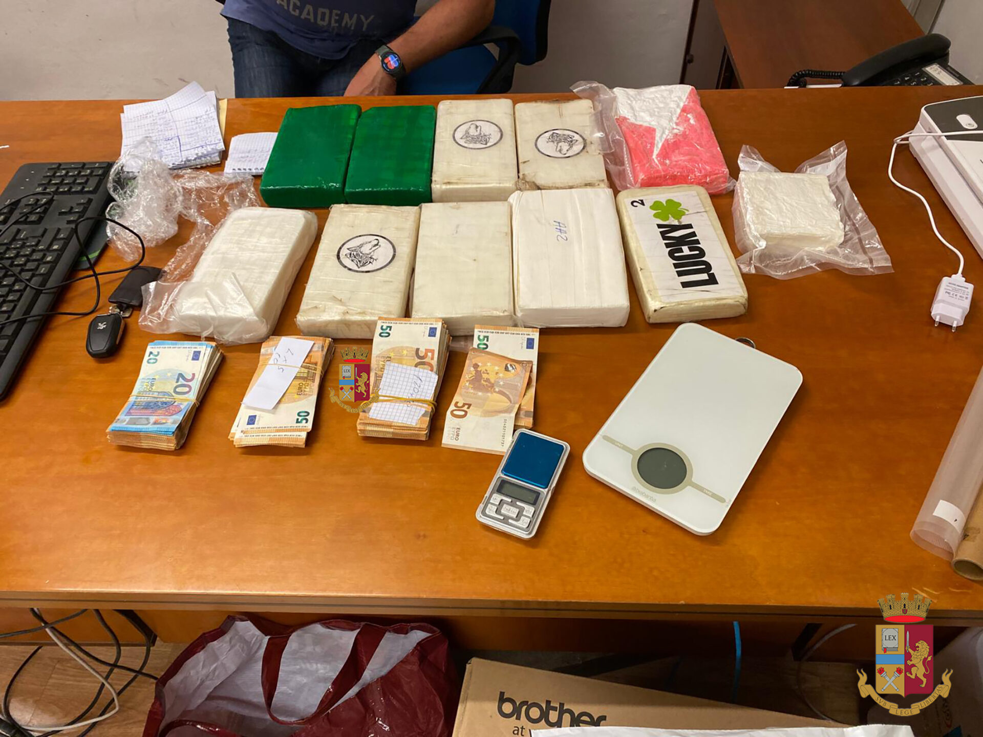 La successiva perquisizione domiciliare effettuata presso l’abitazione del secondo dei correi, sita a Castelnuovo Berardenga, ha consentito, con l’ausilio di personale della Squadra Mobile di Siena, il rinvenimento per il successivo sequestro di oltre 10 kg di sostanza stupefacente del tipo cocaina, materiale per il confezionamento e 16 mila euro in contanti, verosimile provento dell’attività illecita.