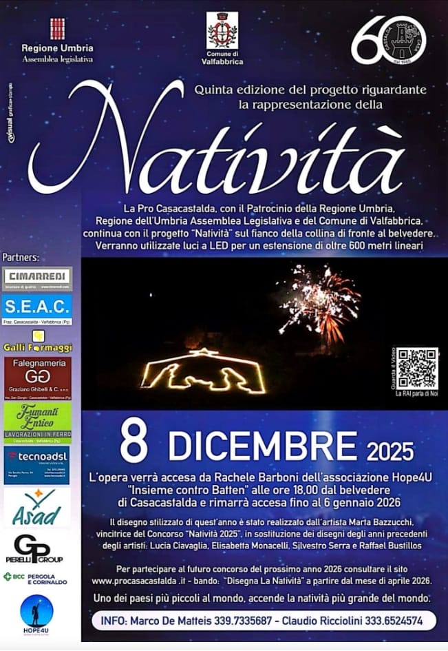 L’accensione ufficiale avverrà l’8 dicembre 2025 alle ore 18:00 e sarà affidata a Rachele Barboni dell’associazione Hope4U nell’ambito dell’iniziativa “Insieme contro Batten”. La natività rimarrà visibile fino al 6 gennaio 2026, illuminando le festività di Casacastalda.Il disegno stilizzato di quest’anno è opera di Marta Bazzucchi, vincitrice del concorso “Natività 2025”, che ha raccolto il testimone dai precedenti artisti Lucia Ciavaglia, Elisabetta Monacelli, Silvestro Serra e Raffael Bustillos. Questo progetto rafforza la tradizione artistica locale, offrendo ogni anno una nuova interpretazione della Natività e coinvolgendo sempre di più la comunità.La manifestazione, supportata da numerosi partner locali, non è soltanto un’occasione di aggregazione, ma anche di solidarietà e visibilità per le associazioni del territorio impegnate in cause sociali. Per tutti gli interessati a partecipare al prossimo concorso, il sito www.procasacastalda.it ospiterà presto il bando “Disegna la Natività” relativo all’edizione 2026.Casacastalda si riconferma tra i paesi più piccoli al mondo con la natività più grande del mondo, attrazione unica nel cuore dell’Umbria.
