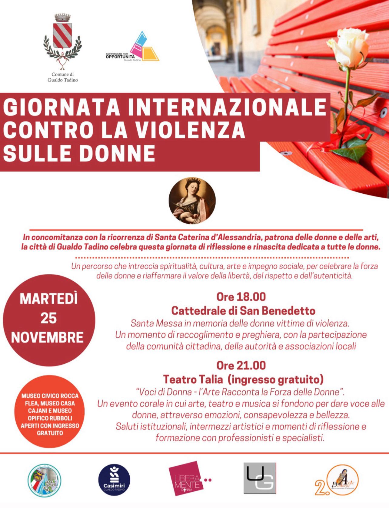 • Ore 21:00 – Spettacolo di arte varia presso il Teatro Comunale Talia, con contributi di artisti, professionisti e realtà associative sul tema della prevenzione e del contrasto alla violenza di genere.