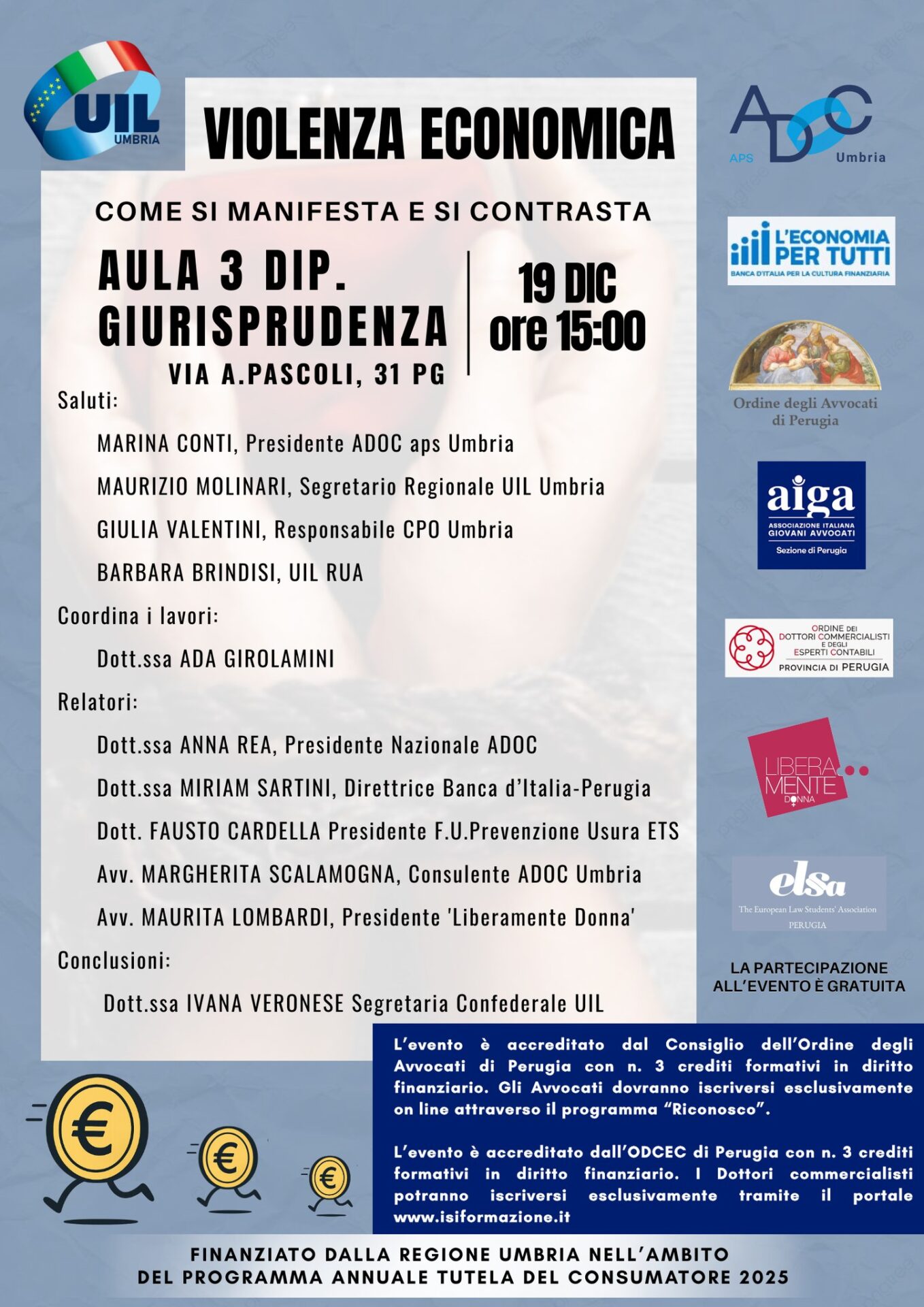 “La violenza economica è una delle forme più subdole e meno riconosciute di violenza, ma anche una delle più diffuse. Si manifesta quando una persona è privata della libertà di gestire o disporre delle proprie risorse economiche, o quando la sua dipendenza finanziaria da altri diventa uno strumento di controllo, ricatto o annientamento personale, o per mancanza di totale autonomia economica: quando percepiscono stipendi troppo bassi per vivere dignitosamente, quando mancano nuove competenze per entrare o restare nel mondo del lavoro, o quando il lavoro stesso non basta per garantire indipendenza”, dicono Adoc Umbria e Uil Umbria. Da qui il progetto che è in corso sul territorio, per prevenire qualsiasi fenomeno e indirizzare verso realtà di sostegno concreto