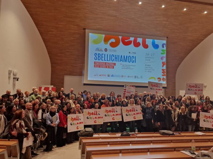 A proposito di azioni, dal palco romano della Sapienza, Fabiana Cruciani, Coordinatrice della Rete Nazionale delle Scuole di Pace e Dirigente Scolastica dell’ITTS “A. Volta” di Perugia ha indicato otto proposte concrete di lavoro: adesione al Programma nazionale di Educazione civica “Sbellichiamoci”; celebrazione degli 800 anni di San Francesco d’Assisi con il Programma “Sui passi di Francesco”; partecipazione al Meeting Nazionale delle Scuole di Pace “Sui Passi di Francesco” e al Giro d’Italia per la Pace; adozione del “Quaderno degli Esercizi di Pace”; partecipazione alla Giornata nazionale della Cura delle Persone e del Pianeta del 27 febbraio 2026; adesione al Movimento delle Bambine e dei Bambini per la pace; collaborazione alla costruzione del Curricolo della Pace.