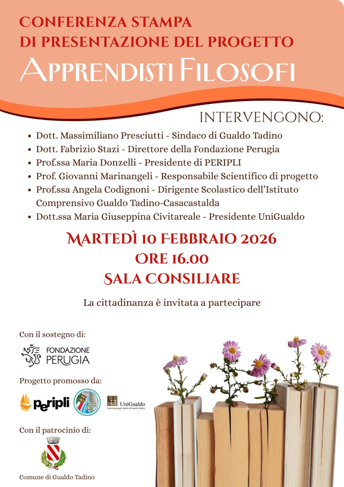 Si terrà martedì 10 febbraio 2026, presso la Sala Consiliare del Comune di Gualdo Tadino, la conferenza stampa di presentazione del progetto “Apprendisti Filosofi”, un’iniziativa culturale ed educativa pensata per promuovere il pensiero critico, il dialogo e la riflessione filosofica come strumenti di crescita individuale e collettiva.