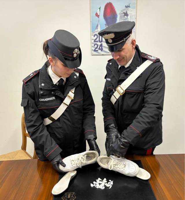 L’intuizione dei Carabinieri ha consentito di rinvenire e sequestrare 25 involucri di sostanza stupefacente, risultata essere cocaina, per un peso complessivo di circa 11 g, abilmente occultati all’interno delle sue scarpe, oltre alla somma di denaro contante di circa 200 euro, ritenuta verosimilmente costituire il provento dell’attività illecita di spaccio.