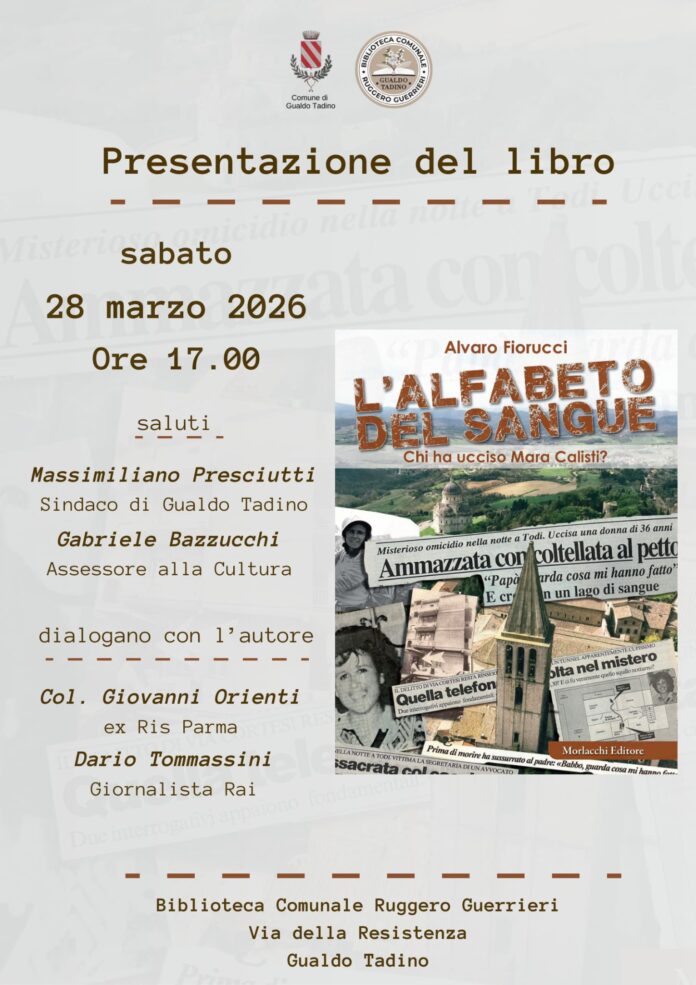 L’Amministrazione Comunale di Gualdo Tadino ospita sabato 28 marzo alle ore 17.00, presso la Biblioteca Comunale Ruggero Guerrieri, un appuntamento dedicato all’approfondimento della cronaca nera e della ricerca della verità. L’iniziativa vede la presentazione dell’ultimo libro del giornalista Alvaro Fiorucci, intitolato “L’alfabeto del sangue. Chi ha ucciso Mara Calisti?”, pubblicato da Morlacchi Editore. Il volume analizza uno dei misteri più complessi del panorama giudiziario umbro, ovvero l’omicidio della giovane donna avvenuto a Todi il 15 luglio 1993, un delitto che a distanza di oltre trent’anni resta ancora privo di un colpevole.