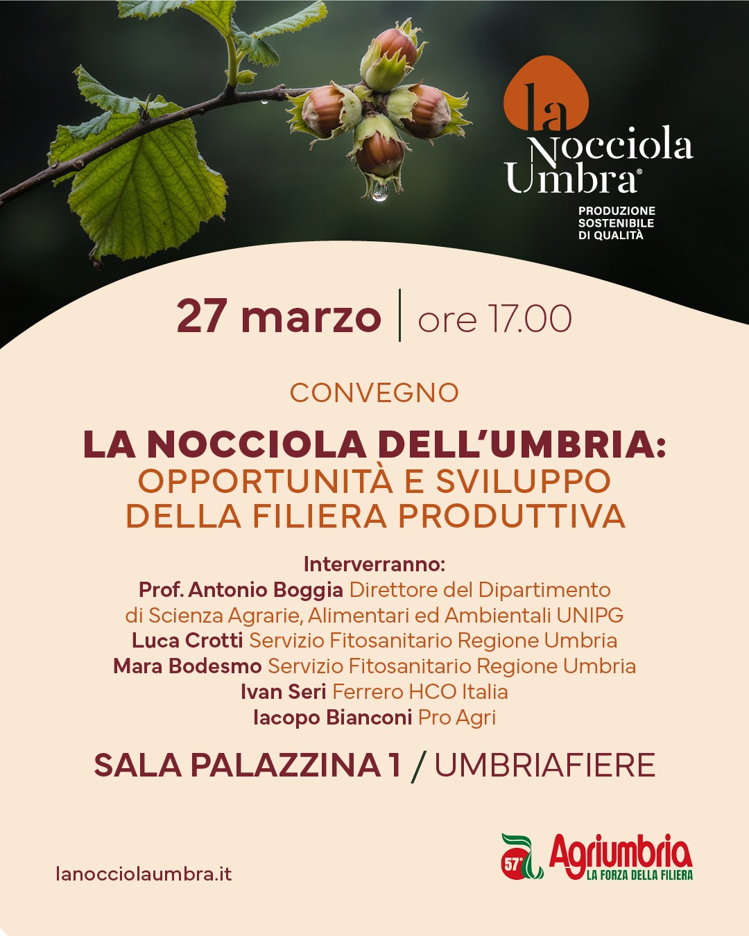 Si terrà venerdì 27 marzo alle 17 nella sala Palazzina 1 a Umbriafiere di Bastia Umbra, nell’ambito dell’edizione 2026 di Agriumbria, il convegno “La nocciola dell’Umbria: opportunità e sviluppo della filiera produttiva”. Interverranno Antonio Boggia (direttore Dipartimento di scienze agraria, alimentari e ambientali dell’Università degli Studi di Perugia), Luca Crotti e Mara Bodesmo (Servizio fitosanitario Regione Umbria), Ivan Seri (Ferrero Hco Italia), Iacopo Bianconi (Pro Agri).