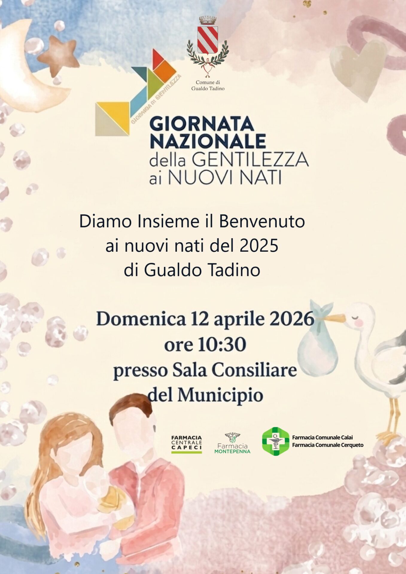 Domenica 12 aprile 2026, alle ore 10:30, la Sala Consiliare del Municipio ospiterà infatti la Giornata Nazionale della Gentilezza ai Nuovi Nati, un appuntamento speciale dedicato a tutti i bambini nati nel corso dell’anno 2025.